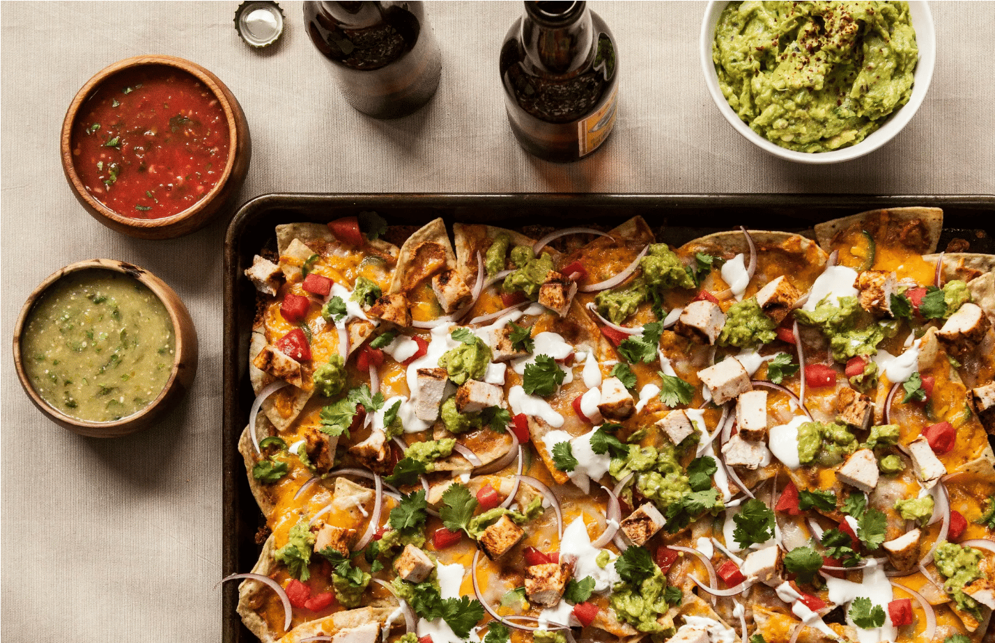 Nachos are non-negotiable on game day, and this version is next level. Grilled, chili-spiced chicken layered over crunchy tortilla chips, melty cheddar and Monterey Jack, jalapeños, fresh tomatoes, and a homemade pinto bean dip that pulls it all together.